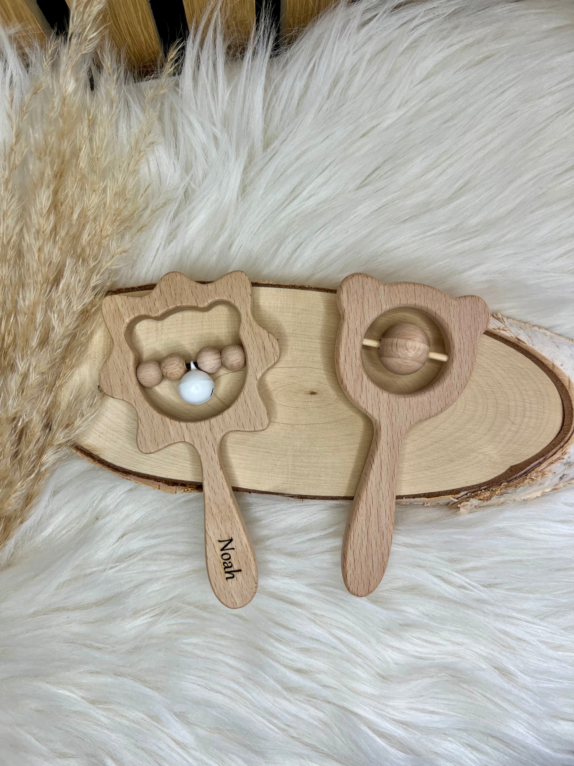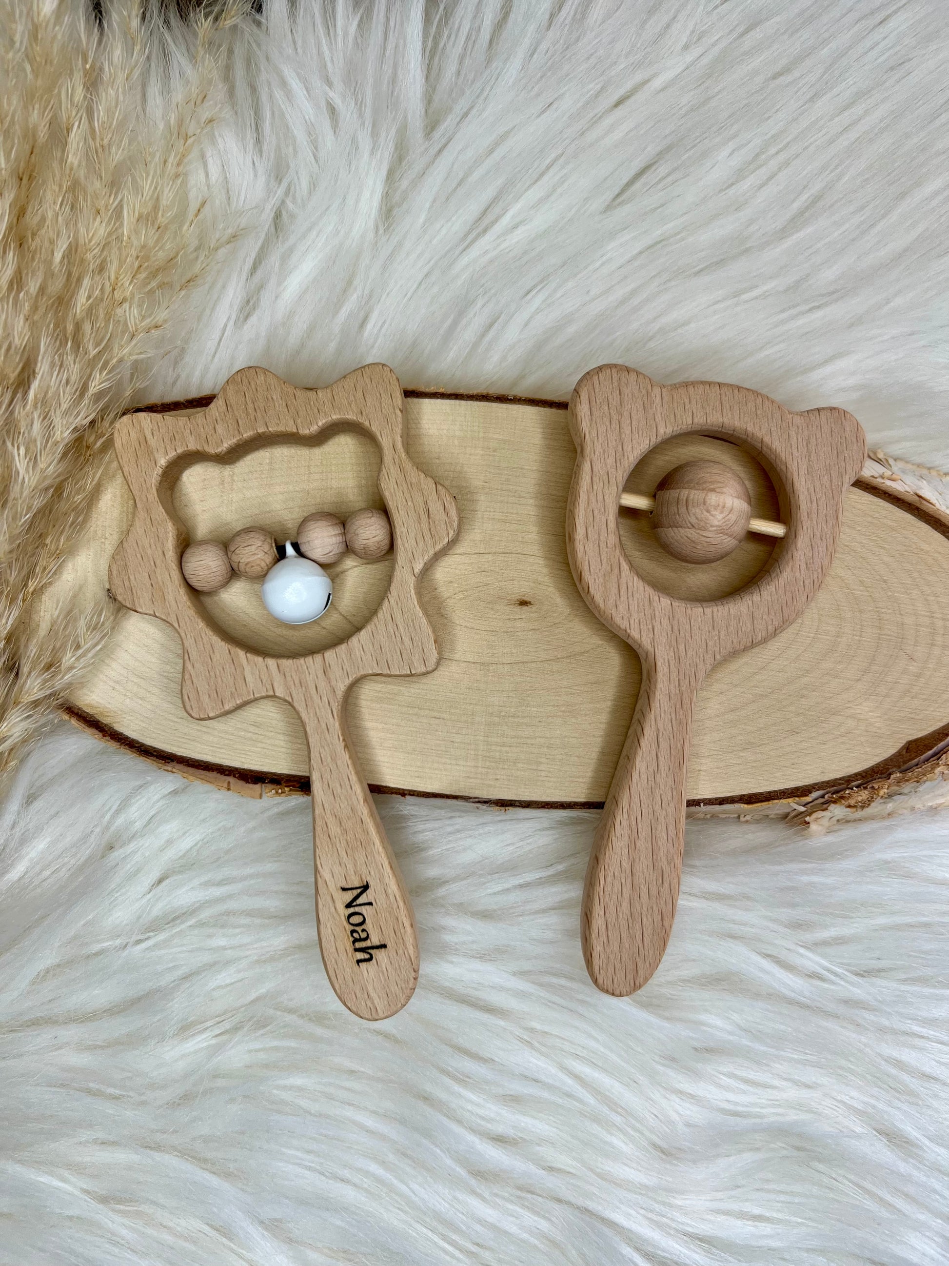 Personalisierte Holzrassel – Löwe & Bär | Babygeschenk mit Namen | 100% Naturholz