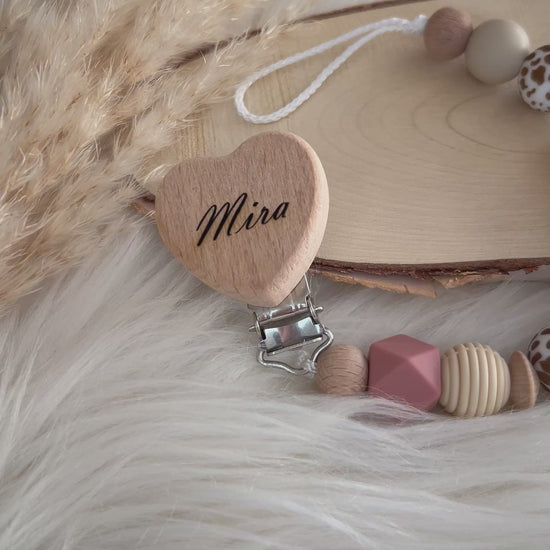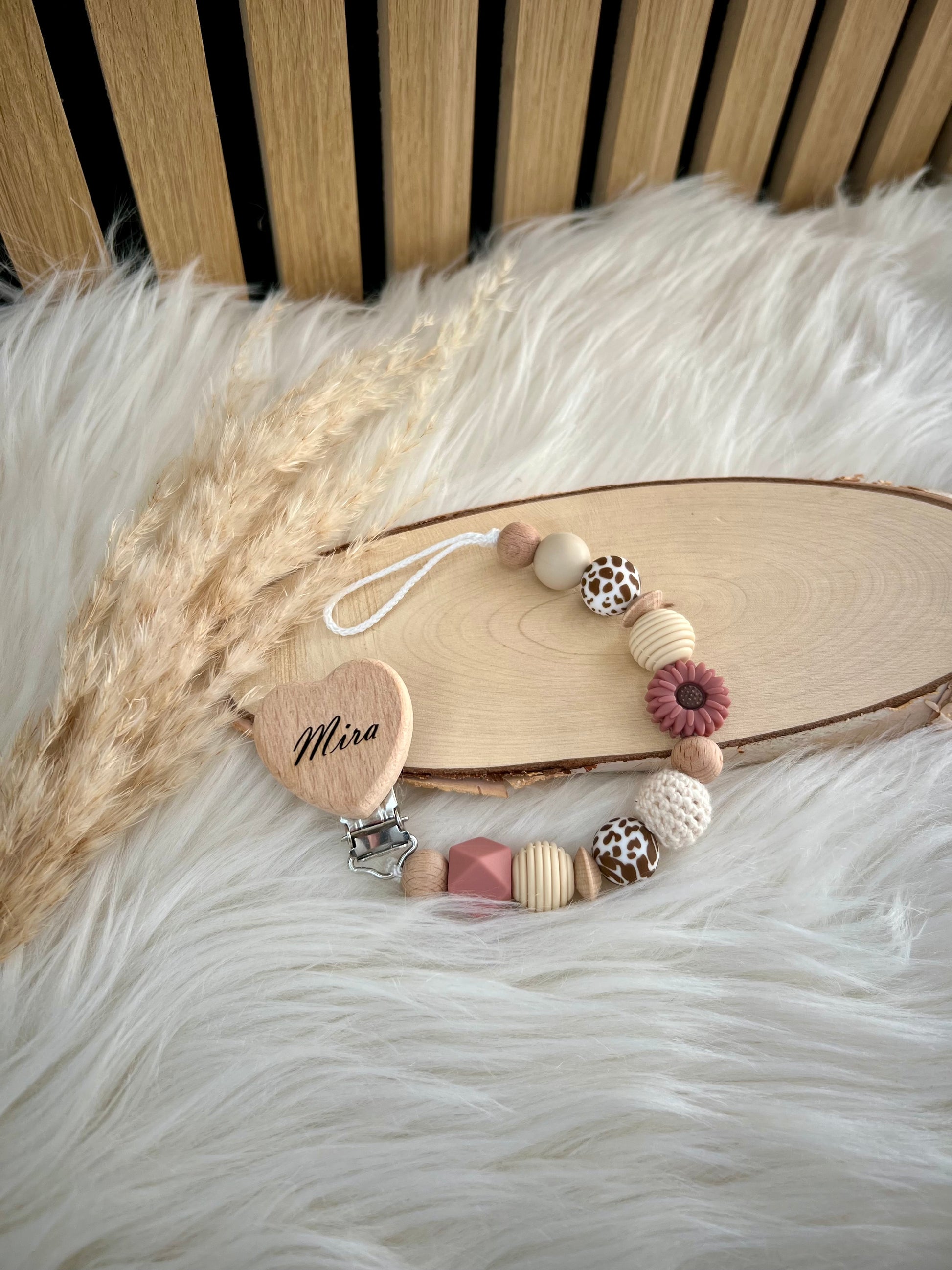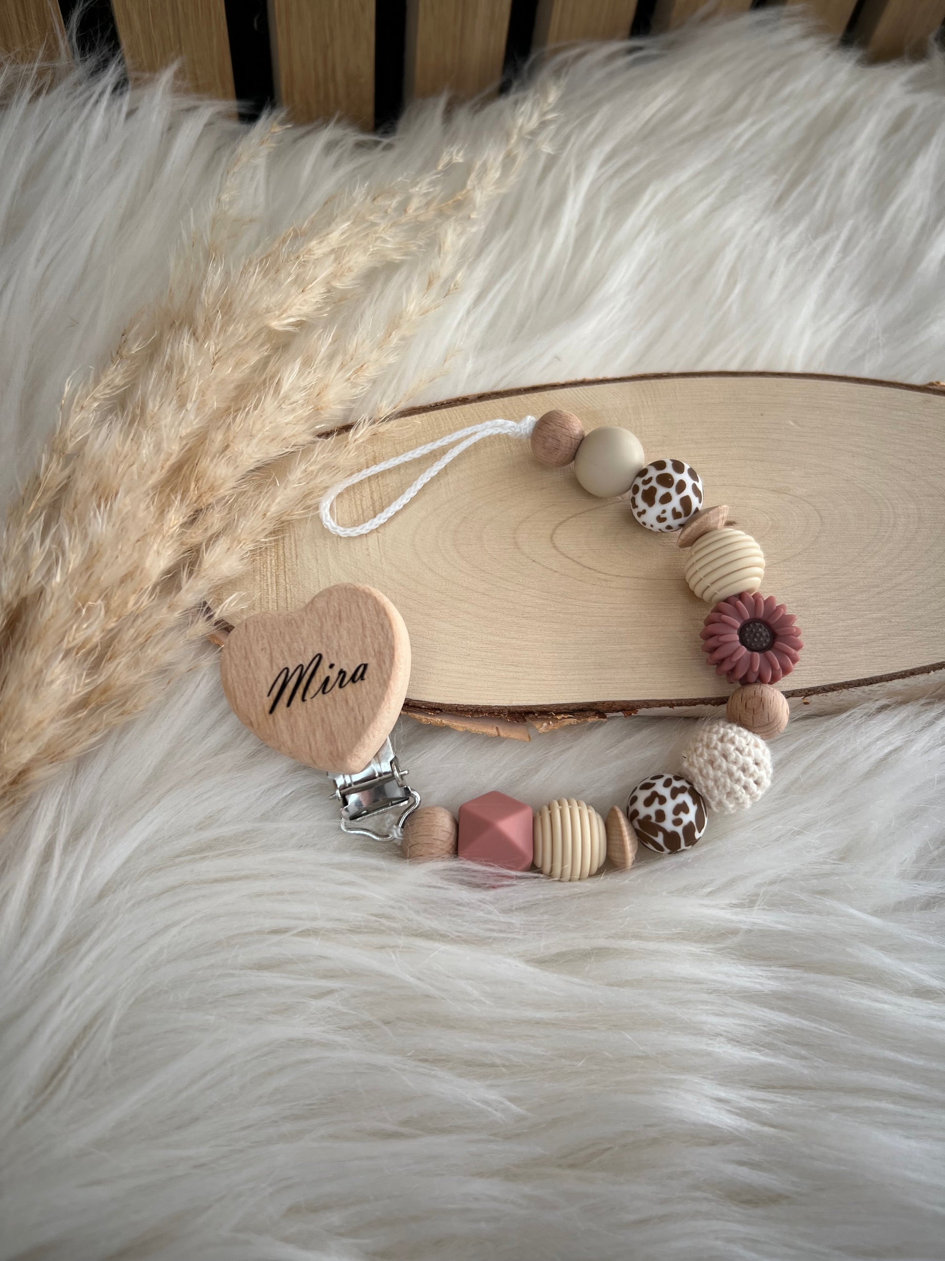 Personalisierte Schnullerkette „Mira“ | Natur • Beige • Rost • Blume & Safari