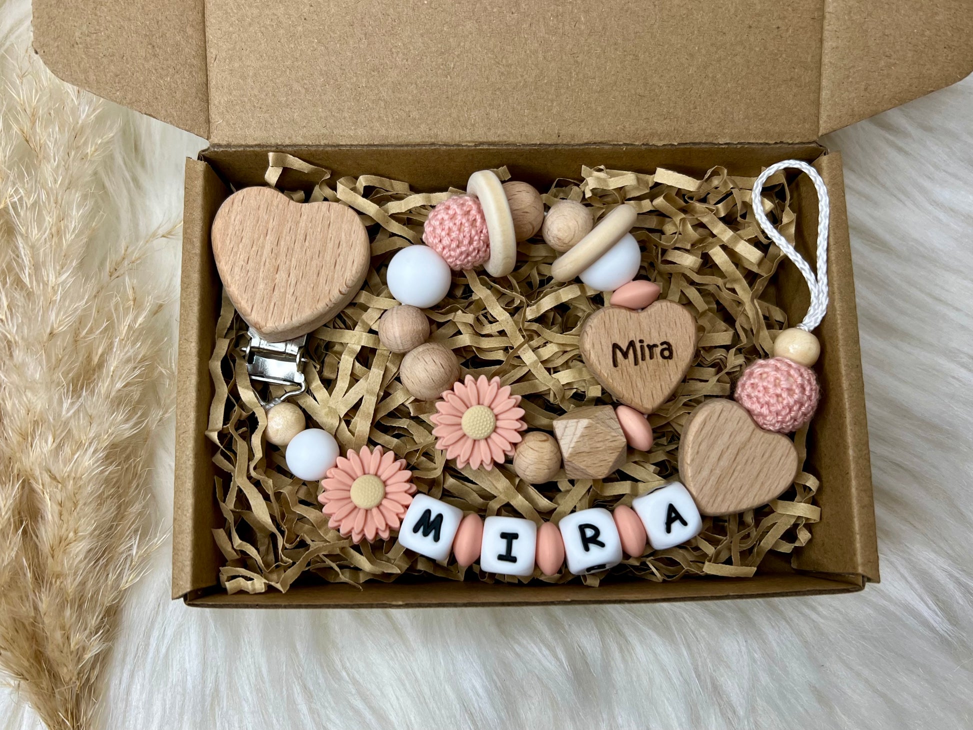 Personalisierte Schnullerkette & Greifling – Handgefertigtes Babygeschenk in Apricot- und Naturtönen