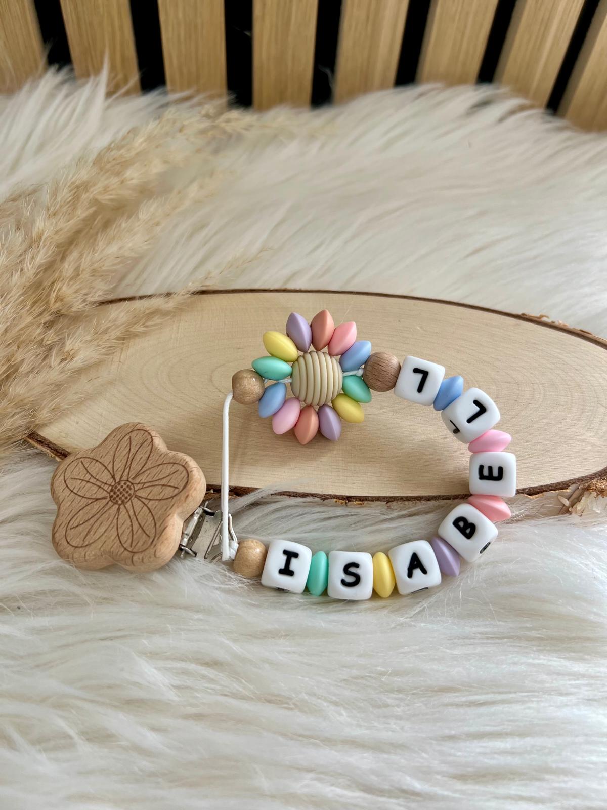 Diese liebevoll handgefertigte Schnullerkette mit deinem Wunschnamen kombiniert zarte Pastellfarben mit hochwertigem Holz und einer bezaubernden Blumenperle. Ein stilvolles Accessoire für kleine Mädchen und ein perfektes Geschenk zur Geburt oder Babyshower.
